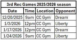 3rd Grade Rec team - Please bring your own ball (size 28.5) and wear a reversible jersey